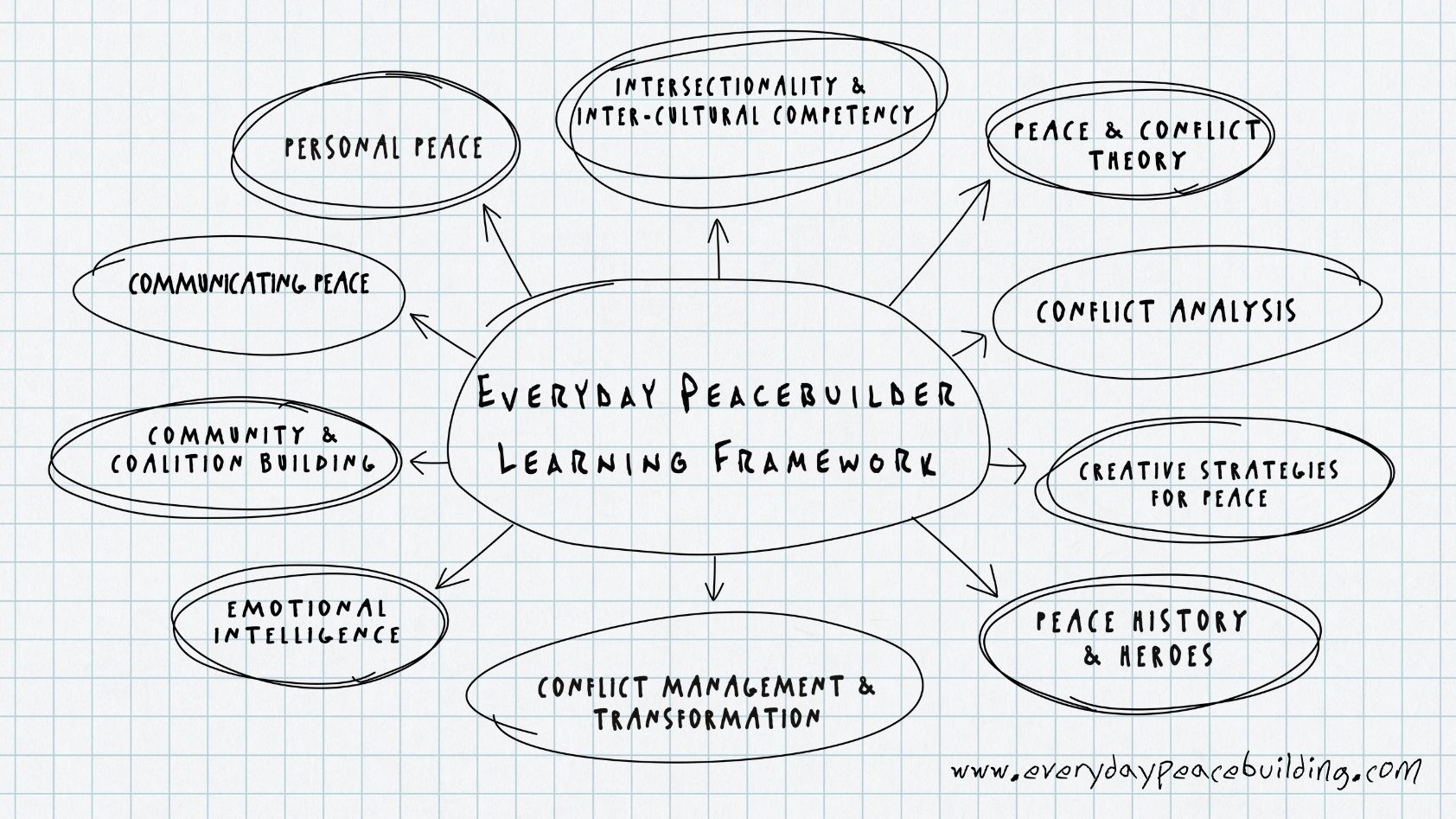 Framework Overview: The purpose of this learning framework is to make you a more effective peacebuilder. You don’t need to know all of these things or even be strong in all of these. Learning in these areas will strengthen your capacity for building peace, ultimately helping you be able to transform issues you care about and make peace a reality. All segments are interrelated.